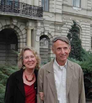 Poet Kathryn Stripling Byer and her husband Professor Emeritus James Byer at the Miklós Révai utca entrance to Győr's City Hall, following the ceremony honoring Harold Schiffman